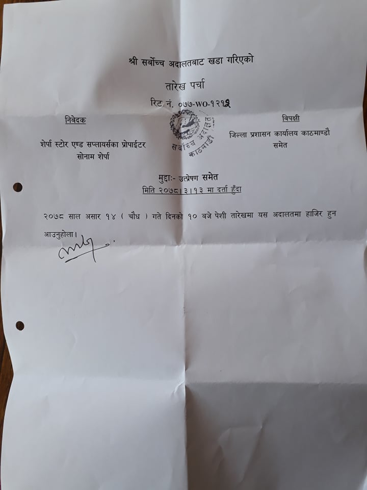 ब्यवसायीक हक, हित र अधिकारका लागि महासंघका अध्यक्ष शेर्पा निरन्तर सक्रियहरुमा लागिरहनु भएको छ । सर्बोच्चमा दर्ता भएको उक्त रिट निवेदनको भोली सोमबार देखि सुनुवाई हुने रिट दर्ता पछि सर्वोच्च अदालतले जारि गरेको तारेख पर्चामा उल्लेख गरिएको छ ।