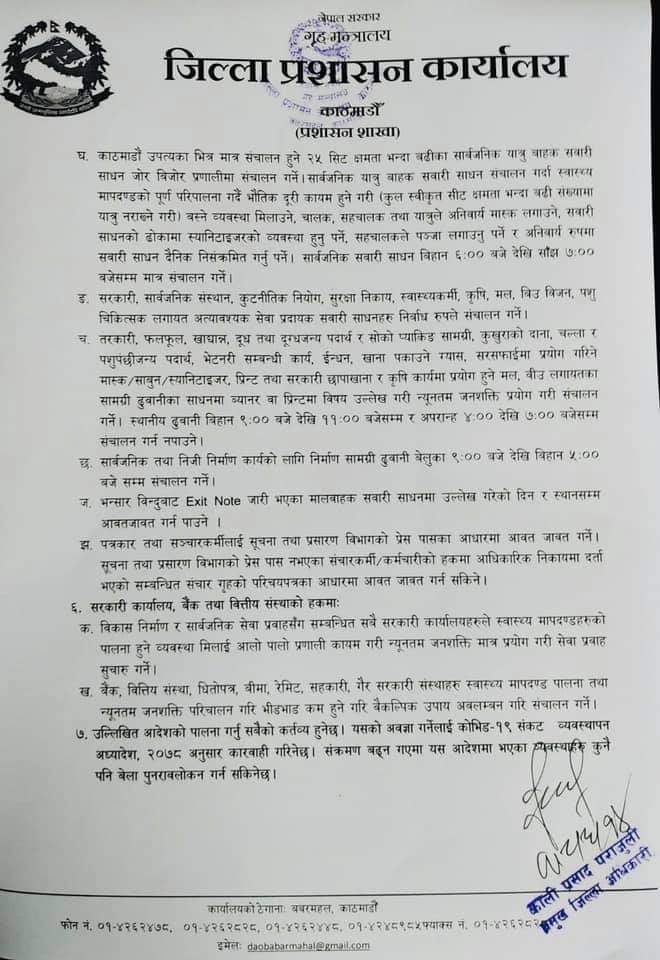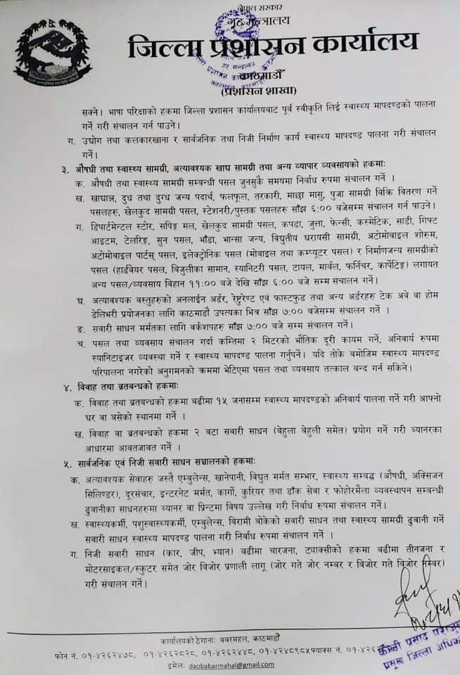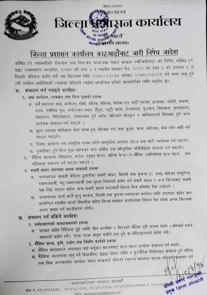 साेमबार काठमान्डाै जिल्ला प्रशासन कार्यालयबाट जारि गरिएकाे सुचना