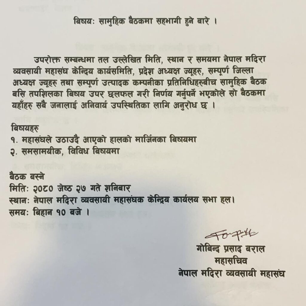 नेपाल मदिरा व्यवसायी महासंघले मदिरा व्यवसाय संचालनमा आएको चुनौति समधानका लागि थप निर्णय गर्न मदिरा व्यवसायी संघका जिल्ला अध्यक्षहरुको भेला आयोजना गरेको छ । जेठ २७ गते काठमान्डौमा सम्पन्न हुने उक्त भेलाले व्यवसायीहरुका समस्याहरुको दिगो समधान गर्न ठोस निर्णय गर्ने बताइएको छ ।